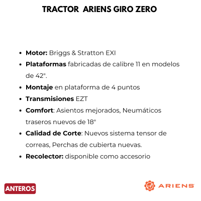 El Tractor Ariens 42″ Giro Zero, cuenta con una plataforma fabricada de 107 cm (42″) de acero resistente de calibre 11. El elevador de plataforma operado con el pie ofrece un ajuste rápido y fácil de la altura de corte. El sistema de elevación de plataforma de cuatro puntos ofrece una estabilidad inigualable y un corte uniforme. Asiento acolchado con respaldo alto incluido de serie para mayor comodidad del operador.