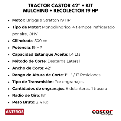 Inicio / Tienda / AGRICULTURA / TRACTOR CASTOR 42″ + KIT MULCHING + RECOLECTOR 19 HP